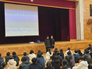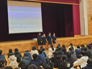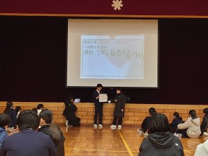 この開催に当たっては、1学期から市内8校の小学6年生とSDGsの勉強をして担任の先生方をはじめ各校長先生と相談のうえ進めてきました。お互い同じ中学校へ通う校区内交流ということもあり、先に学校紹介をして会を始めました。3つの小学校がそれぞれに、全員が意見を自由に交換できる環境で、明るく安心して成長できる学校と紹介をしていたことが印象に残りました。