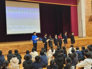 「こどもサミット 辰口地区」と題し、2025年12月17日㈬の1.2限目、能美市立辰口中央小学校の体育館へ集合する形で、辰口中央、和気、宮竹の3小学校の6年生計145名が、自分たちが描いた環境食育絵日記「こうなったらいいな・2030年の能美」を元に、カードゲーム形式でまちづくりの課題への対策を考え理解を深めました。