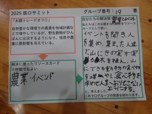 「自然豊かな環境での農業を地域計画などで増やしているが、野生動物が出没し、住民や農業に悪影響を与えている。」というトレードオフに対して、「農業」、「イベント」の2つをリソースとして使い、「「イベント」を開き、人を集め、集まった人たちで「農業」体験として、山に木の実が実る木を植え、山にできる動物の食べ物を増やし、食べ物を求めて人里へおりてこないようにする。」と答えてくれたグループがありました。2025年今年の漢字1位が「熊」のように全国で熊による被害が相次いでいて、この問題も年々身近な問題となっています。子どもたちの意見としては、動物と共存できる環境を整えるといった意見が多いと感じました。同じ課題でも違うリソースを使うといろいろなアイデアが出てきます。このカードゲームの良いところは間違いがないということです。どんな発想でも良いので、堂々と言うことができます。。