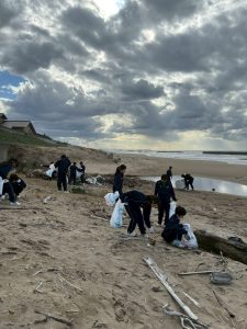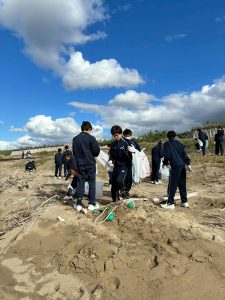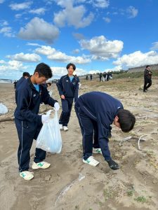 心配していた雨にはあわず、曇り空での作業となりました。生徒たちには、魚や鳥が間違えて口にしないように、小さなプラスチックの破片を重点的に集めてもらうことに注意を払ってもらいました。