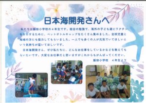 日本海開発さん、ぜひ私たちに、どんなお仕事をしているかなどを教えてもらいたいです。大変なお仕事だと思いますが、これからもがんばってください。」